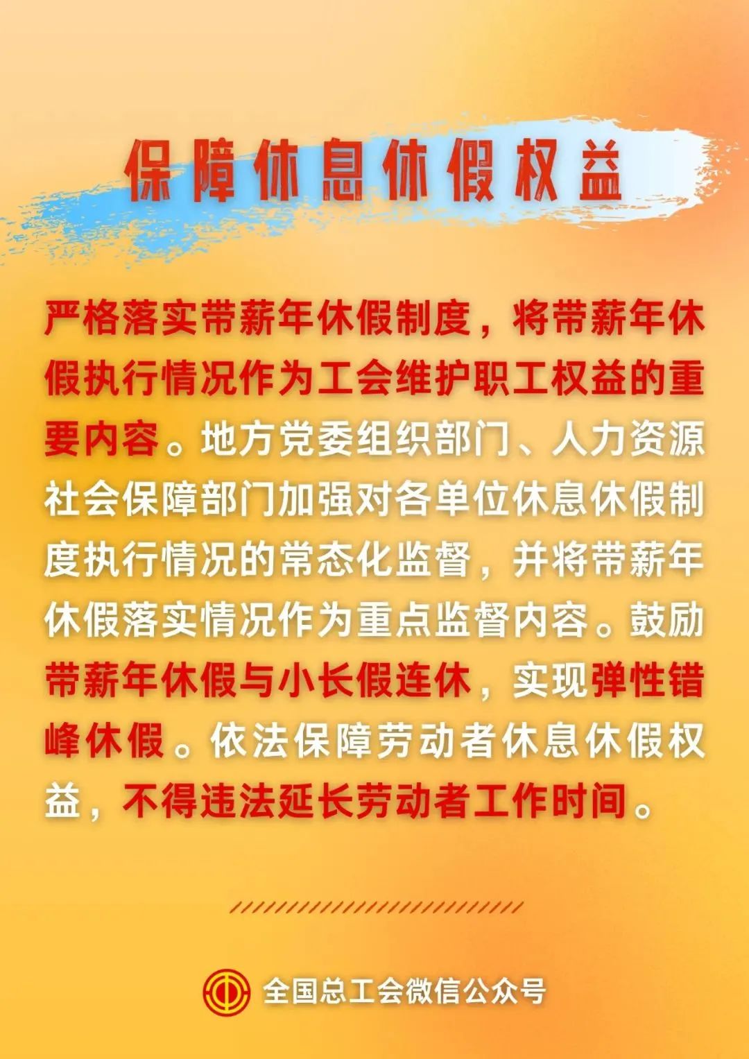 在保障休(xiu)息休(xiu)假(jia)(jia)權益方(fang)(fang)面,行(xing)動方(fang)(fang)案明確,嚴格落實帶薪年(nian)休(xiu)假(jia)(jia)制度。鼓(gu)勵帶薪年(nian)休(xiu)假(jia)(jia)與小長假(jia)(jia)連(lian)休(xiu),實現彈(dan)性(xing)錯峰休(xiu)假(jia)(jia)。依法(fa)保障勞動者休(xiu)息休(xiu)假(jia)(jia)權益,不得(de)違(wei)法(fa)延(yan)長勞動者工作時間。鼓(gu)勵有條件的地方(fang)(fang)結(jie)合(he)實際探索設(she)置中小學春秋假(jia)(jia)。
