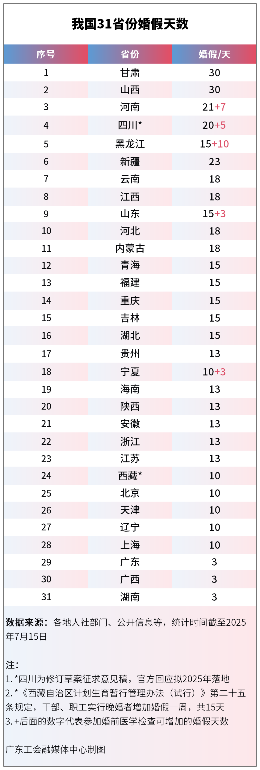 相比之下(xia),廣(guang)東、廣(guang)西、湖南(nan)目前尚未延長婚假,僅執行3天法定婚假。