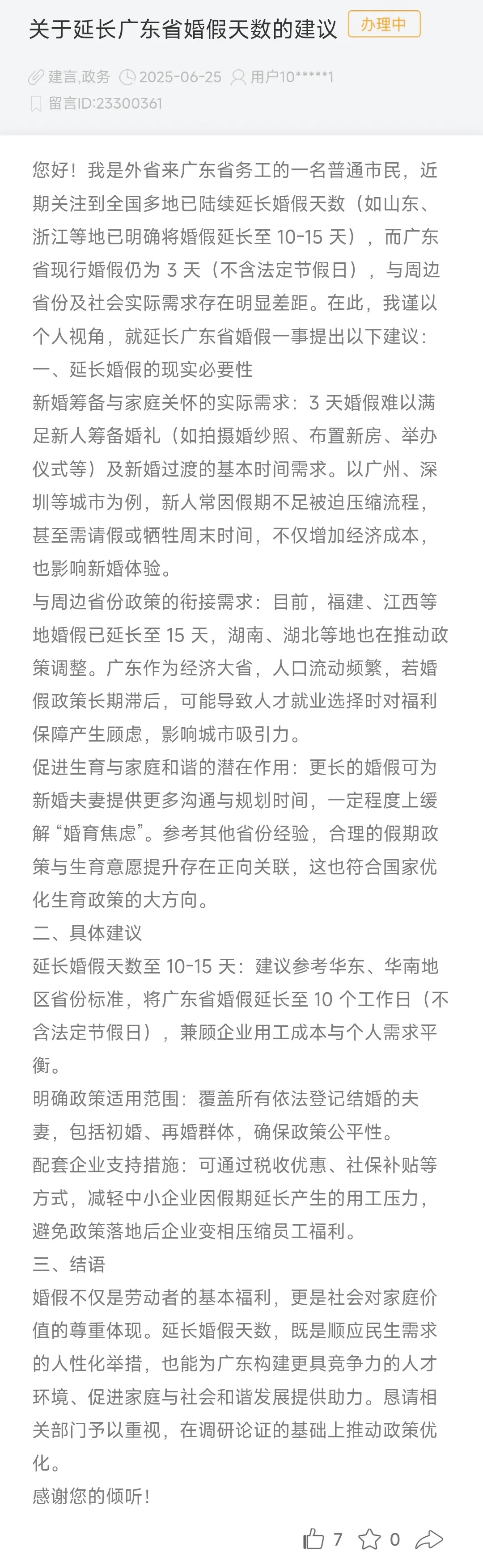 近日,有網(wang)友在人民網(wang)領導留言板上發帖建(jian)議廣東延長婚(hun)假至10-15天(tian),并給出(chu)理由:3天(tian)婚(hun)假無法滿足新人籌(chou)備(bei)婚(hun)禮及(ji)過渡需求;更長婚(hun)假可緩(huan)解“婚(hun)育(yu)焦慮”,與生育(yu)意愿(yuan)提升正(zheng)相(xiang)關(guan),符合國家政策方向(xiang);同時可配套稅收優惠、社保補貼等減輕中小企業用工壓(ya)力(li)。