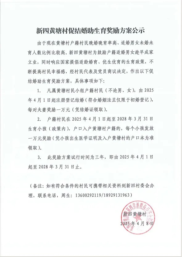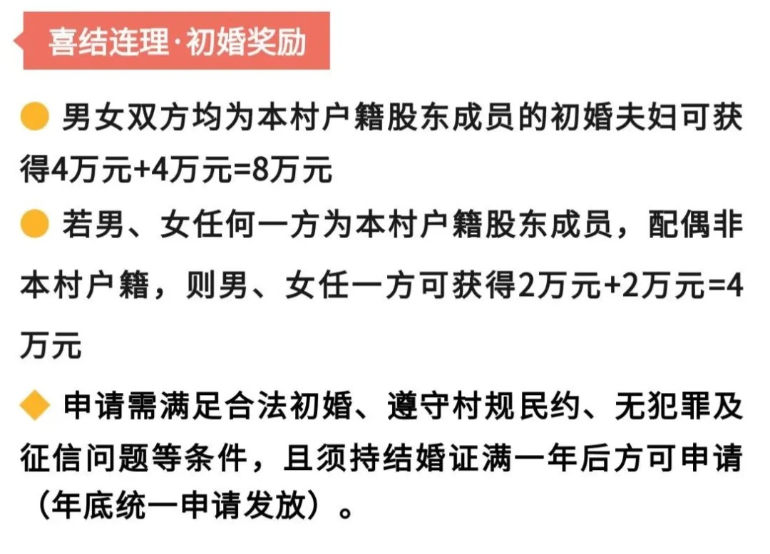 ● 今(jin)年(nian)5月,廣東省(sheng)東莞市橫瀝鎮新四黃塘村(cun)公(gong)布婚育(yu)獎勵(li)方案,符合婚姻法(fa)且(qie)僅限于初婚登記,可(ke)獲一萬(wan)元獎勵(li)。