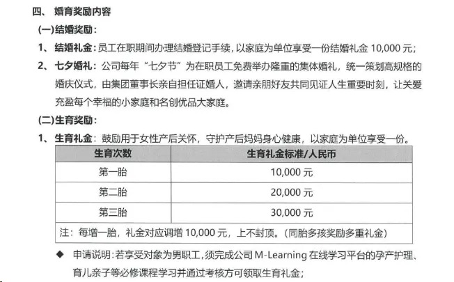 ● 2024年3月,廣東企業名創(chuang)優品發布《婚育獎勵(li)方案》員工在職期間辦理結婚登(deng)記可獲1萬元禮金(jin)獎勵(li)。
