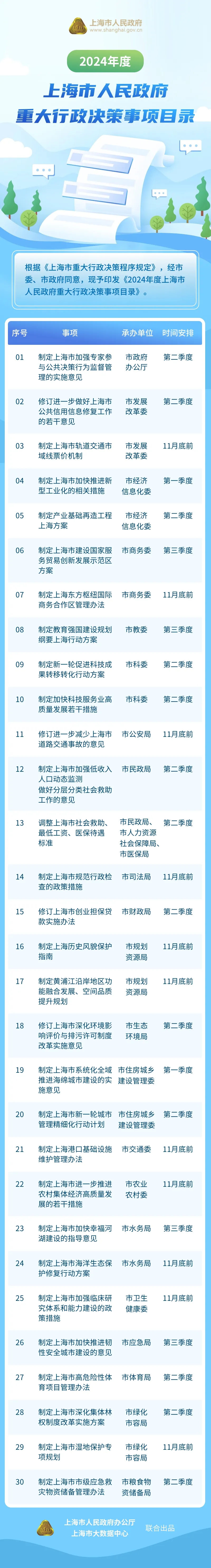 為落(luo)實重大行政(zheng)決策(ce)程序,上海(hai)(hai)市(shi)政(zheng)府辦公廳編制(zhi)(zhi)了(le)《2024年(nian)度上海(hai)(hai)市(shi)人民政(zheng)府重大行政(zheng)決策(ce)事項目錄》,內容(rong)包括制(zhi)(zhi)定上海(hai)(hai)市(shi)軌(gui)道交(jiao)通市(shi)域(yu)線(xian)票(piao)價(jia)機制(zhi)(zhi)、制(zhi)(zhi)定上海(hai)(hai)東方樞紐國際商(shang)務合作區管理(li)辦法(fa)、制(zhi)(zhi)定加快(kuai)科技服務業高質量發展若(ruo)干措(cuo)施等(deng)。詳見↓